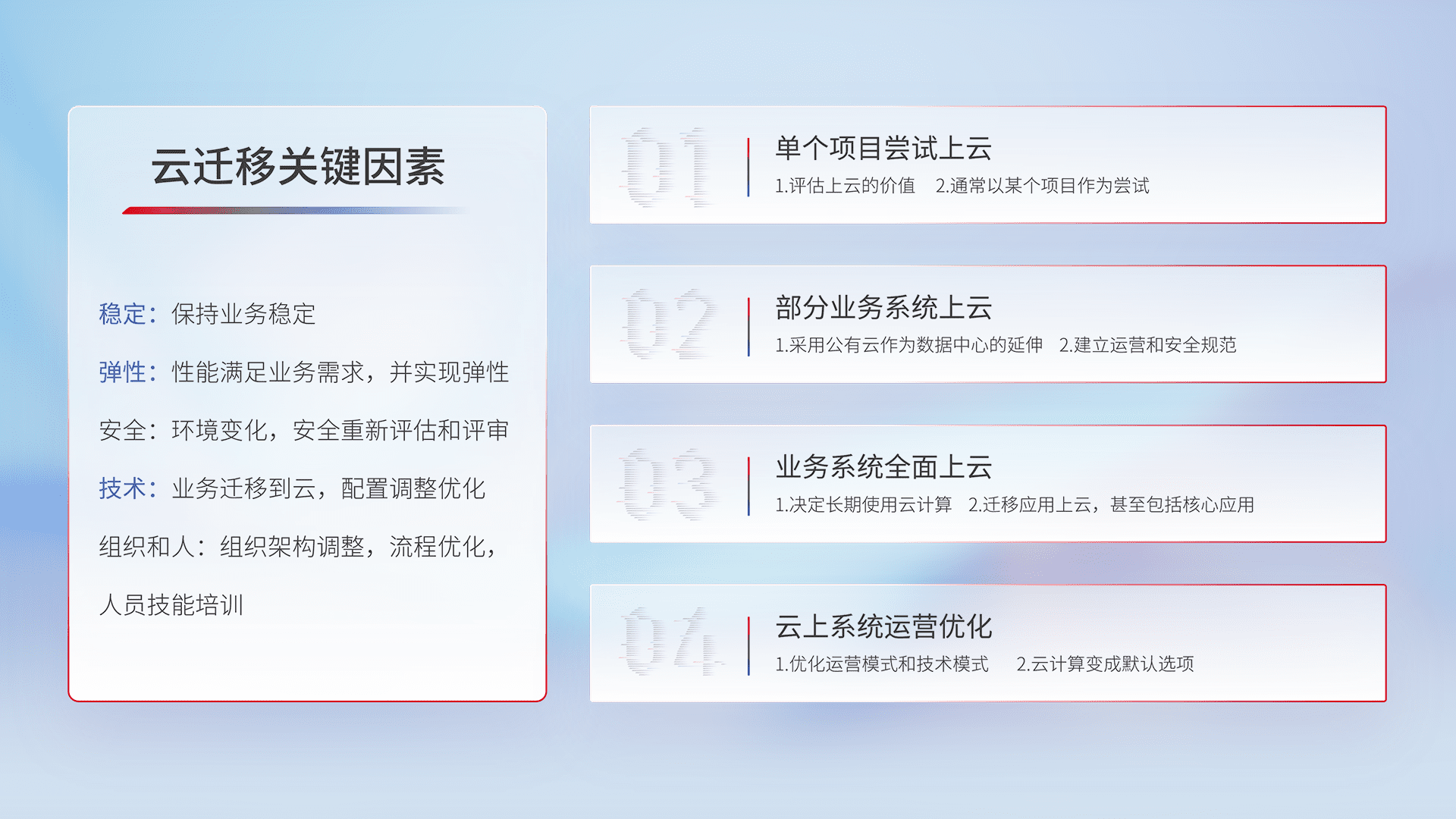 结合实际业务,,,,从规划设计、、、、云平台选型、、云原生改造、、、、数据迁移、、、集成交付,,,迁移全过程为客户识别最佳上云路径,,做好风险识别管理,,,设计网络架构、、、、身份权限、、安全审计合规、、操作审计、、日志审计、、、、监控告警策略、、多站点容灾设计等,,,,对云上基础设施进行整体规划,,,,提升IT治理水平,,以满足弹性、、高可用、、、高性能的需求。。。。